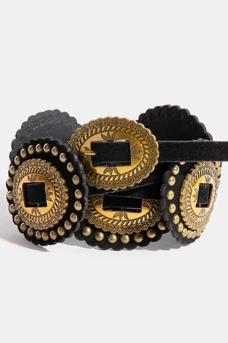 your unique sense of style. THIS BELT APPROXIMATELY MEASURES: LENGTH: 40 INCHES WIDTH: 2 INCHES BU:100% ALLOY BELT:50% POLYURETHANE 50% FLANNELETTE