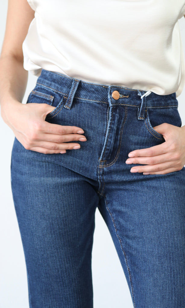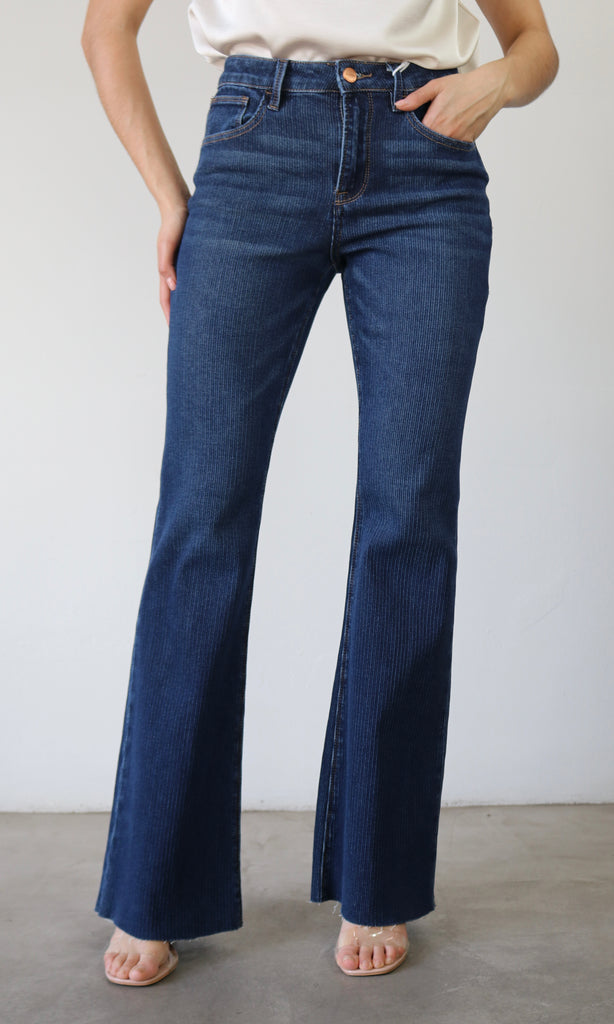 HIGH RISE FLARE JEANS WITH CORDUROY LIKE TEXTURE - Rise 10 1/2" | Inseam 33" in size 3/26 - Model Info: Height 5'9" | Waist 26" | Hips 36" - Model is wearing size 3