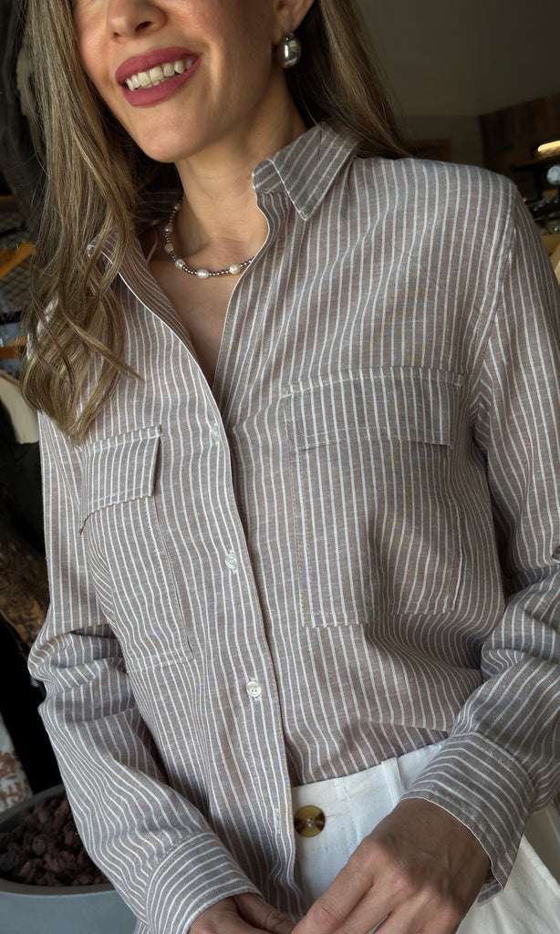 - Two Front Pockets, Roll-Tab Sleeves, Spread Collar & vertical Stripes.
